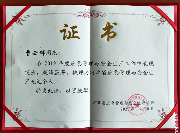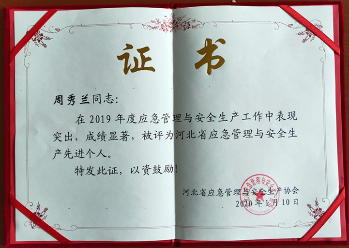 近日,我公司被河北省應(yīng)急管理與安全生產(chǎn)協(xié)會評為2019年度河北省應(yīng)急管理與安全生產(chǎn)先進單位,我公司曹云輝、周秀蘭同志被評為2019年度河北省應(yīng)急管理與安全生產(chǎn)先進個人。