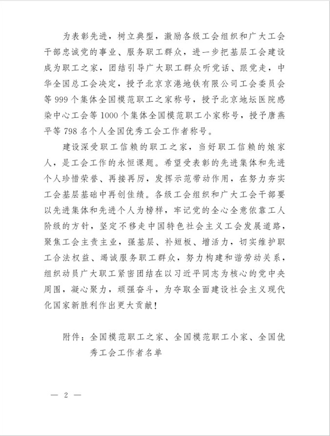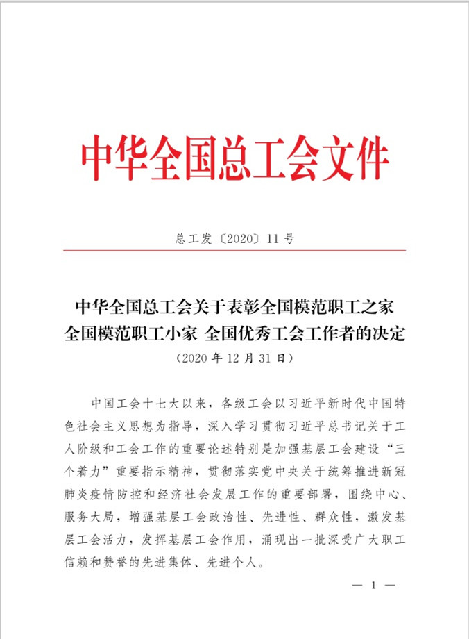 近日,根據中華全國總工會《關于表彰全國模范職工之家 全國模范職工小家 全國優秀工會工作者的決定》(總工發[2020]11號)文件,我公司工會被中華全國總工會授予“全國模范職工小家”榮譽稱號。