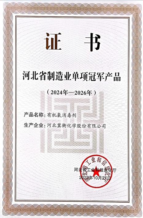近日,河北省工業和信息化廳公布了《2024年河北省制造業單項冠軍企業名單》,河北冀衡化學股份有限公司憑借其在有機氯消毒劑行業領先的制造技術和全球領先的市場份額,榮獲“河北省制造業單項冠軍產品”稱號。